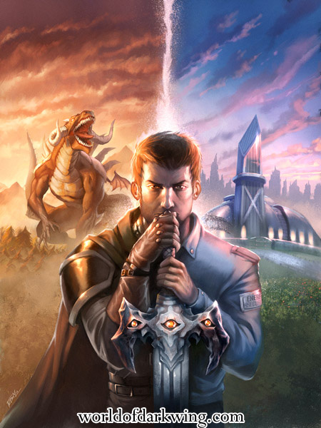 Il concept scelto alla fine è stato quello suggerito da Ute, con il protagonista “diviso” tra la Terra e Corown. Questo primo sviluppo aveva però un drammatico problema: la spada davanti al viso di Peter lo copriva generando un effetto “facepalm” che rasentava il ridicolo. Così l’abbiamo rielaborata in questo modo: