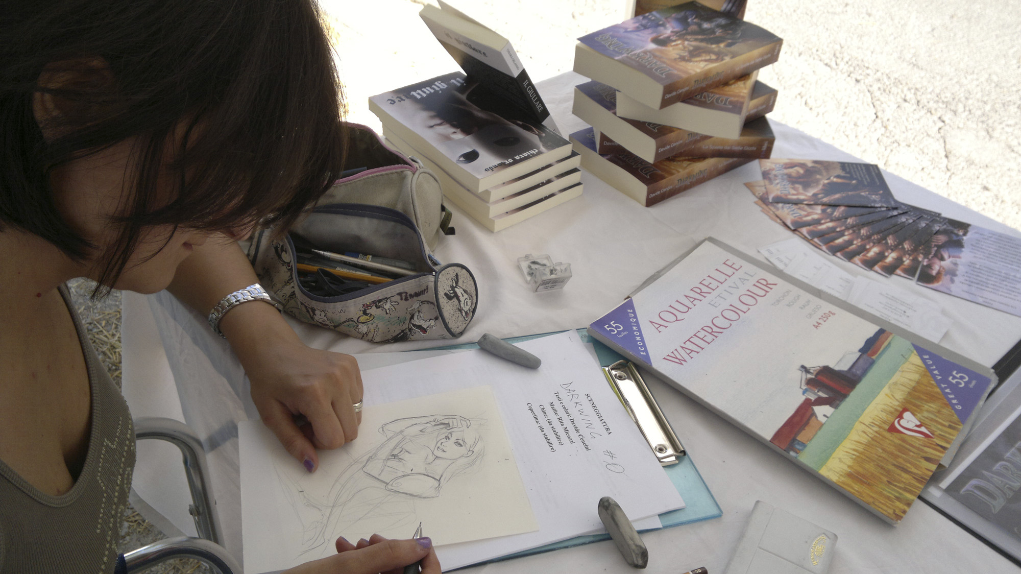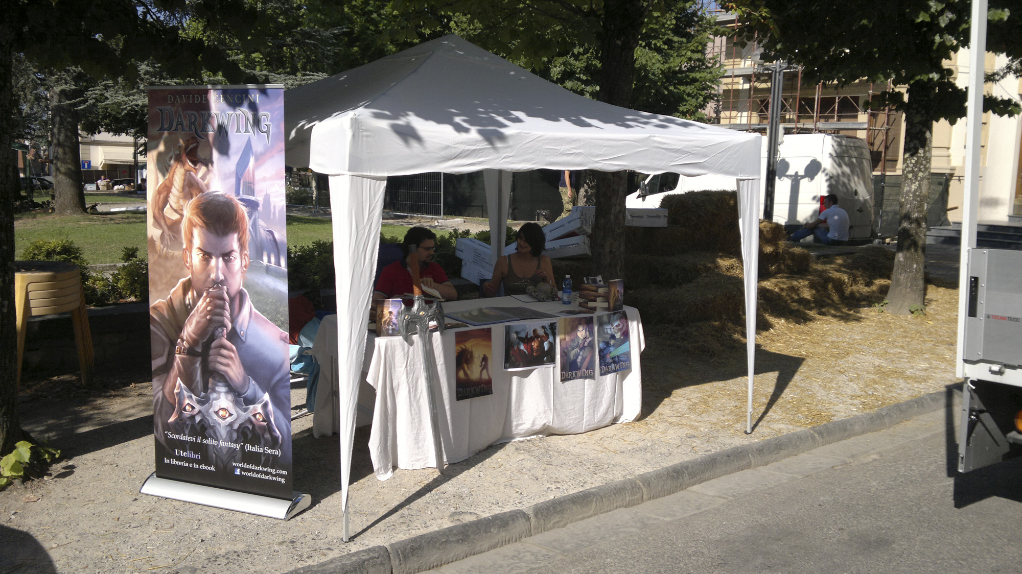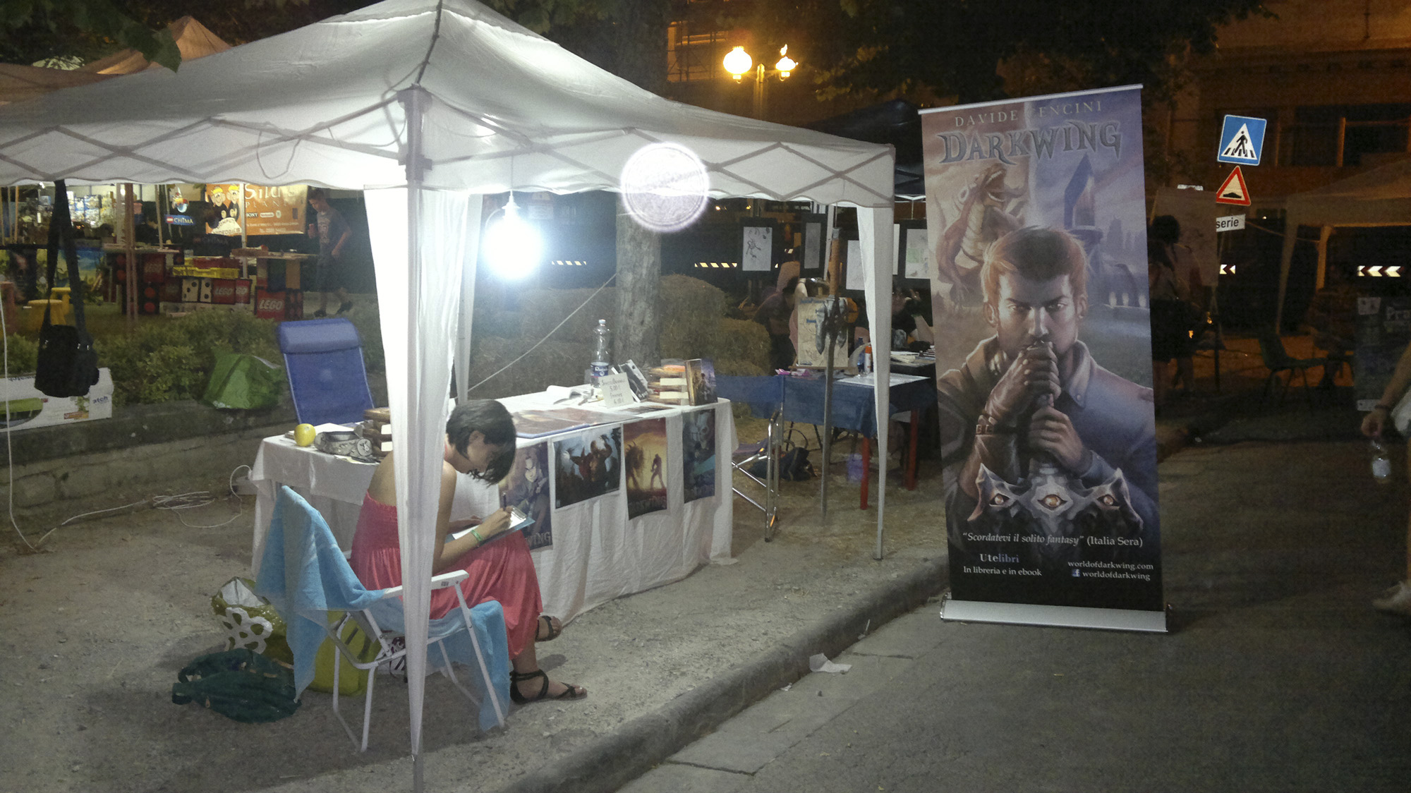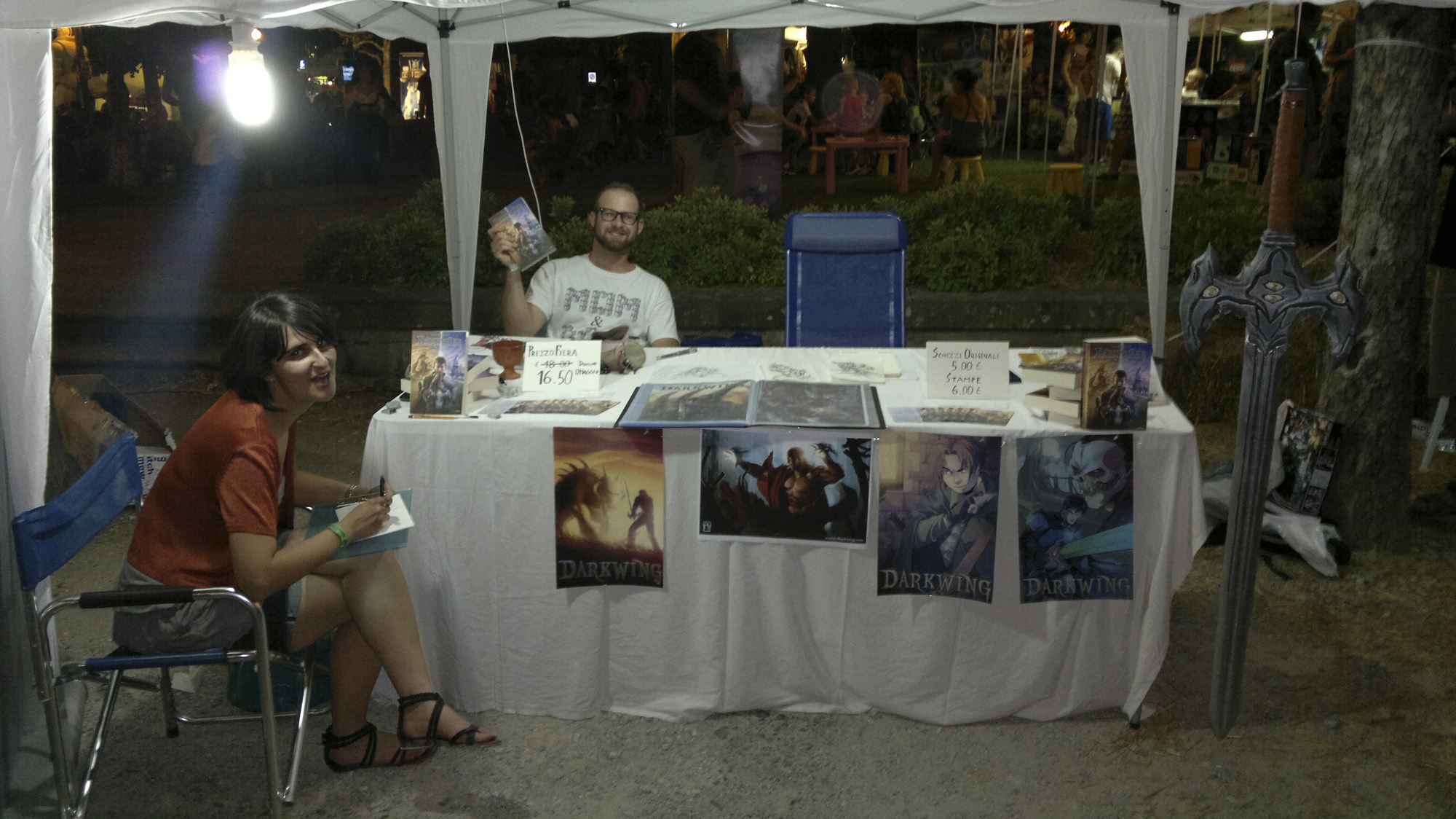 Il nostro stand era ben ubicato in Piazza della Libertà. Ci teniamo a ringraziare le moltissime persone di ogni sesso ed età che ci hanno fatto visita e i tanti nuovi lettori, ben 25 in meno di due giorni, che hanno voluto acquistare una copia di Darkwing: è stato un risultato oltre ogni nostra aspettativa! Questo naturalmente significa che una valanga di nuovi schizzi realizzati in fiera sta per invadere il blog…