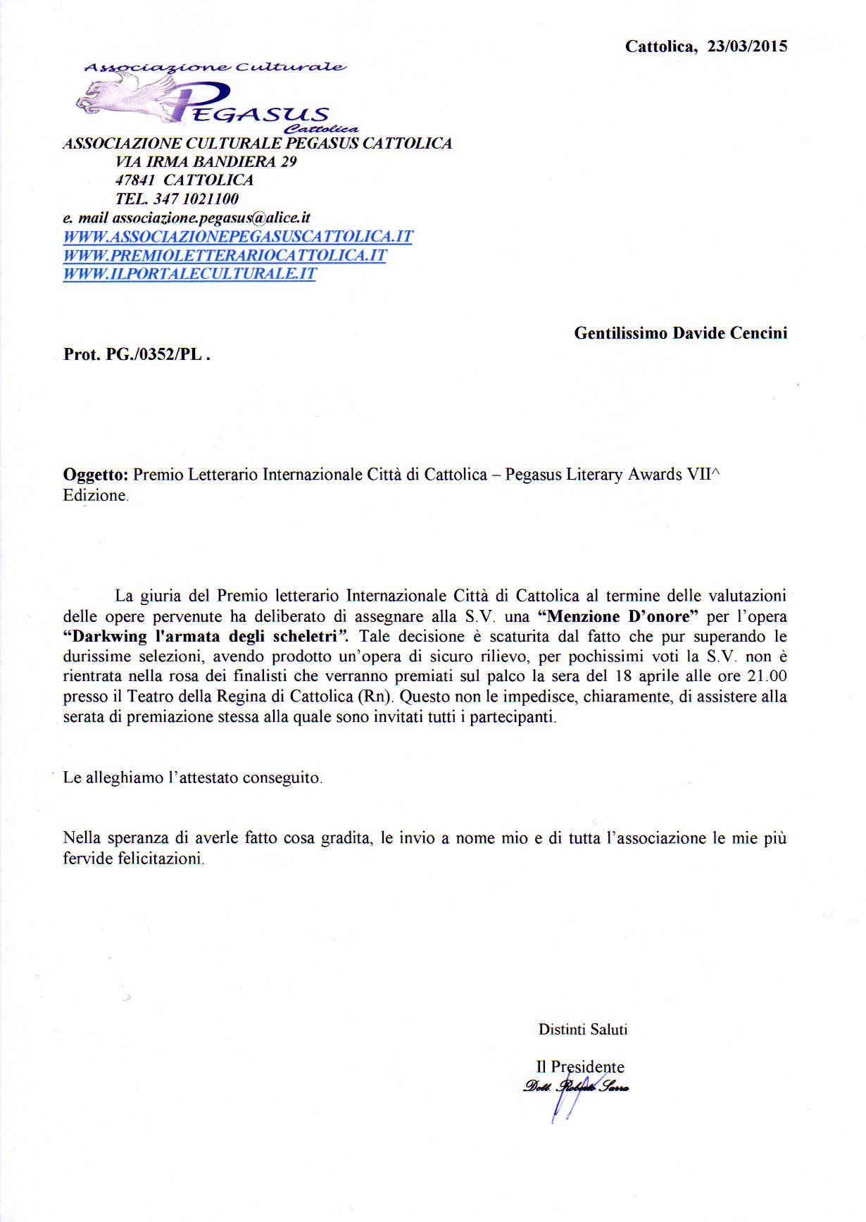 Ci è arrivata proprio stamattina la notizia che la giuria del prestigioso Premio Letterario Internazionale Pegasus di Cattolica ha deciso di assegnare a Darkwing 2 – L’Armata degli Scheletri la menzione d’onore come una delle migliori opere in concorso. Stando al comunicato, l’opera non sarebbe rientrata tra i finalisti solo per pochissimi voti.