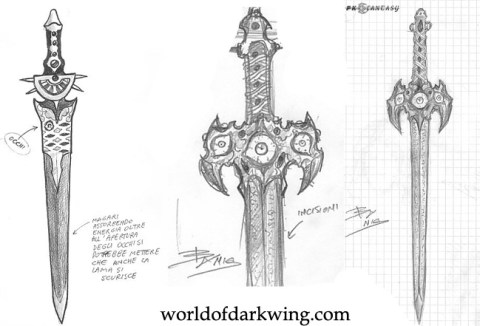 Primissimo concept di PK Fantasy, da notare la Spada dai Sette Occhi ancora non definita e lo scudo sul modello dell’Extransformer. (Rita Micozzi, 2002)