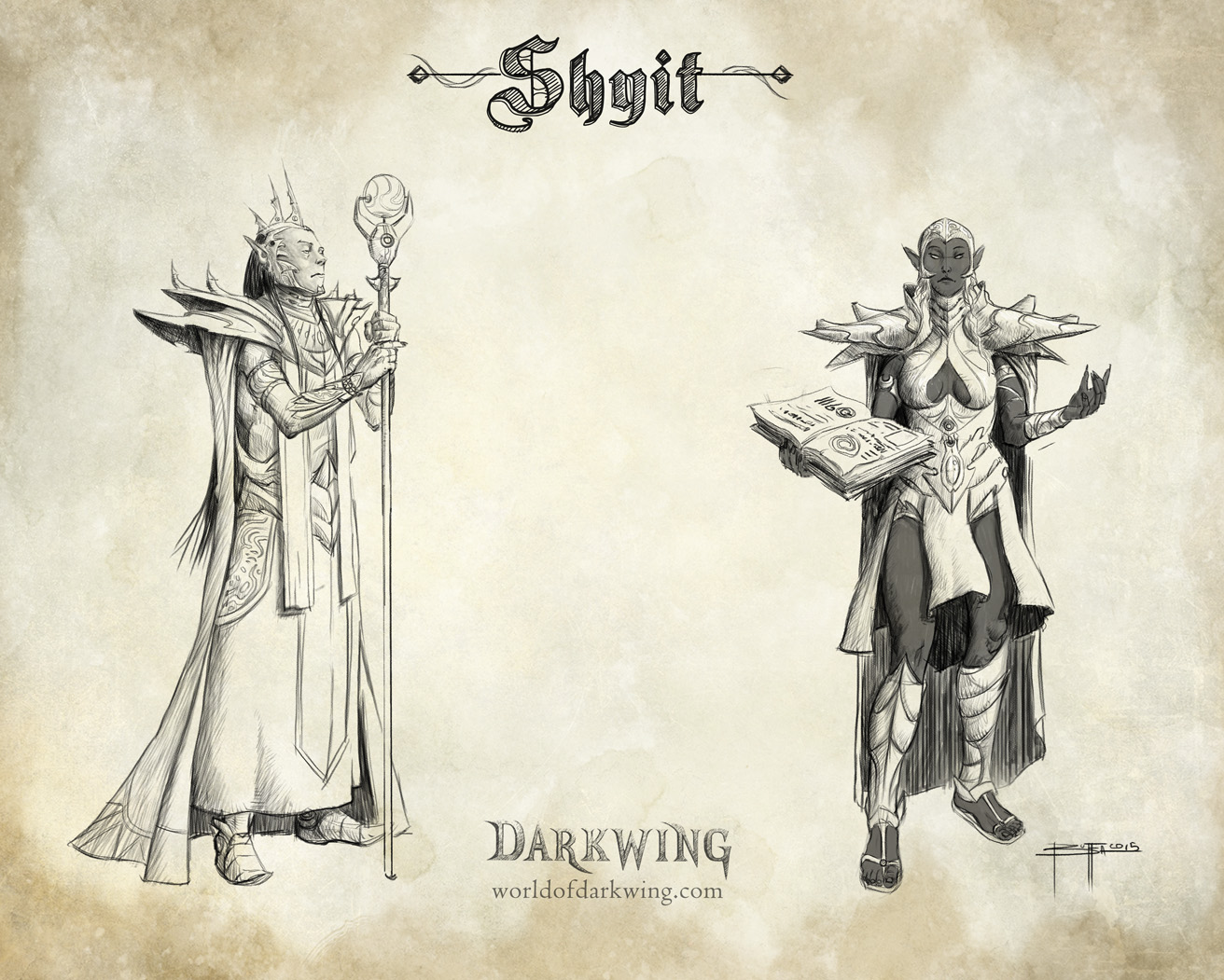 Elfi antichi Shyit (dalla pelle chiara) ed Eld (dalla pelle scura). Studi di Alessandro Buffa.