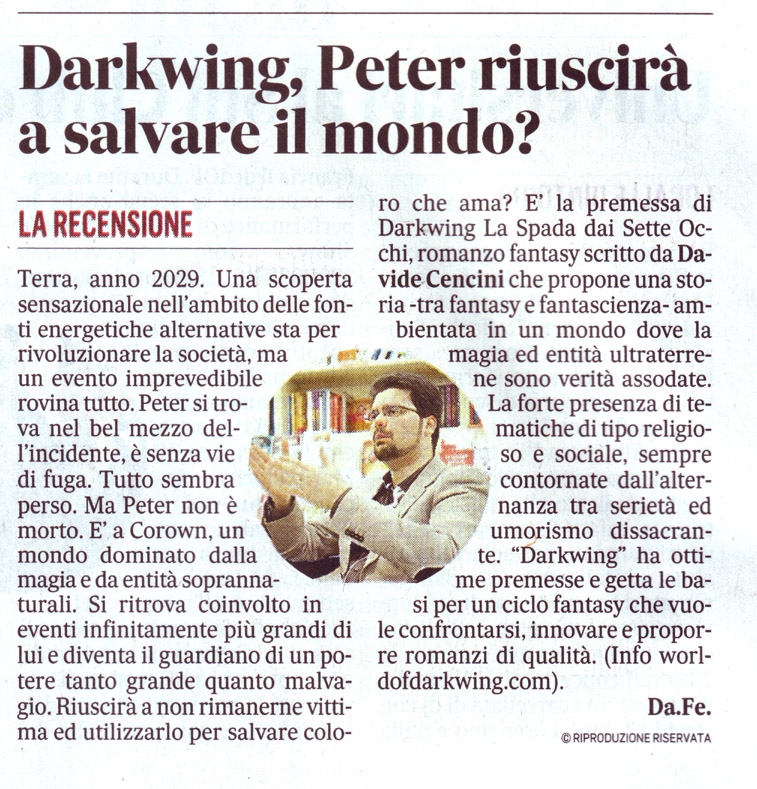 “Davvero professionale per un romanzo autoprodotto, la veste in cui viene presentato Darkwing, opera prima di Davide Cencini, autore di fumetti di origini romane. Questo primo libro segna l’inizio di una nuova saga fantasy che non ha mancato di sorprenderci per la sua incredibile freschezza e vitalità. […] Difficile resistere alla tentazione di divorare un capitolo dopo l’altro, e di volerne ancora una volta finito; perfino coloro che detestano il fantasy non potranno fare a meno di apprezzare lo stile di questo giovane scrittore, che riesce a mescolare con maestria combattimenti spettacolari, momenti intensamente drammatici e una travolgente, dissacrante ironia. Darkwing colpisce nel segno non solo grazie alla solidità della trama e all’originalità con cui è strutturata, alternando parti fantastiche a vicende di crudo realismo, ma anche per la grande umanità dei personaggi, capaci di comunicare e recitare in modo così spontaneo da catturare l’attenzione del lettore. Sebbene il romanzo sia rivolto a un pubblico maturo, non manca di toccare lettori e lettrici di tutte le età, da un lato citando gustosamente film e libri amati dal grande pubblico, dall’altro riuscendo ad affrontare con coraggio e senza peli sulla lingua temi di scottante attualità come il terrorismo e la violenza sulle donne. […] Scordatevi il solito fantasy: Darkwing demolirà gli stereotipi del genere e saprà sorprendervi ad ogni pagina. Il secondo volume è in uscita a Natale 2010. Ordinabile dal sito ufficiale http://worldofdarkwing.com e presso le librerie laFeltrinelli.”